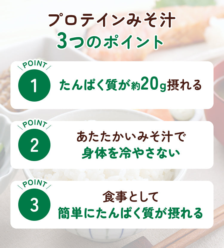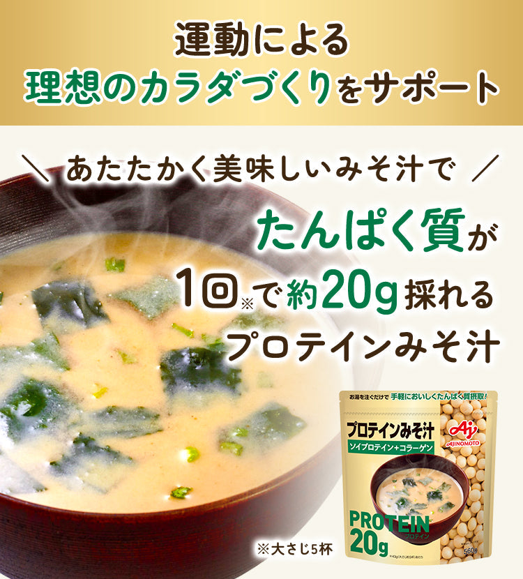 1食でたんぱく質20gを摂れる、温かく甘くないみそ汁味のプロテインです。